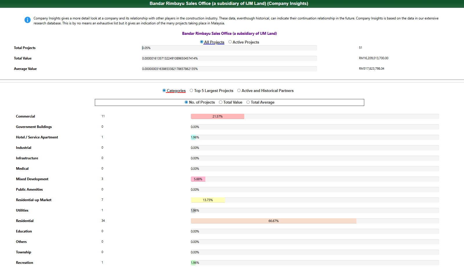 Think of Company Insights as your personal window into a company’s activity and connections in the construction industry. It shows not just their projects, but also how they interact with other players. Even historical data can give hints about ongoing or future collaborations. The insights come from MyBina’s research database—while it’s not every single project in Malaysia, it’s enough to give you a clear picture of the company’s footprint.